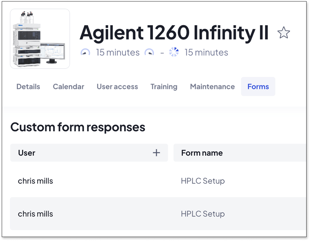 Incident reporting. A user notices something wrong mid-run. With a custom form attached, they can log what happened, describe what they did, and attach photos. All of this can happen at the bench, directly within the booking, without needing to chase people later for details.