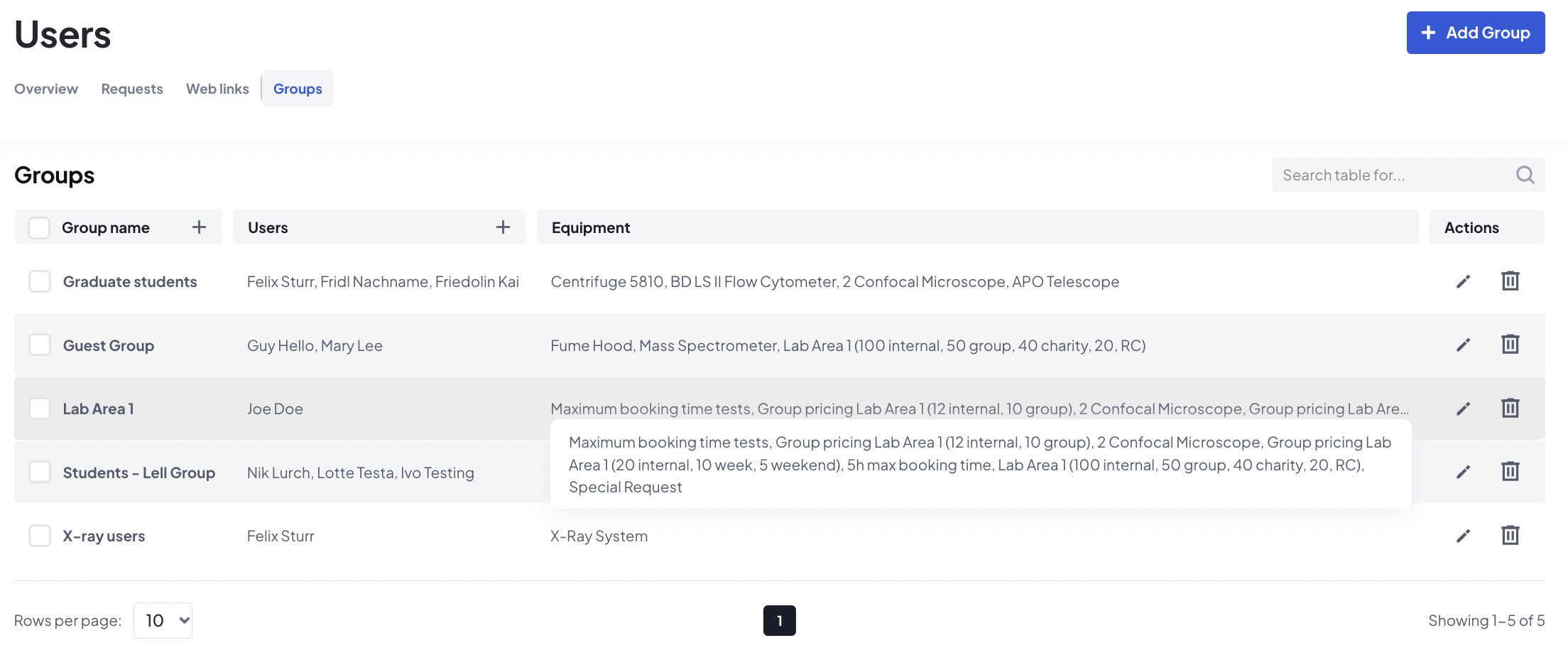 - Groups: here you can find all groups in your lab. This table used to sit outside the Users module but it can now be found next to your user list for easier access.